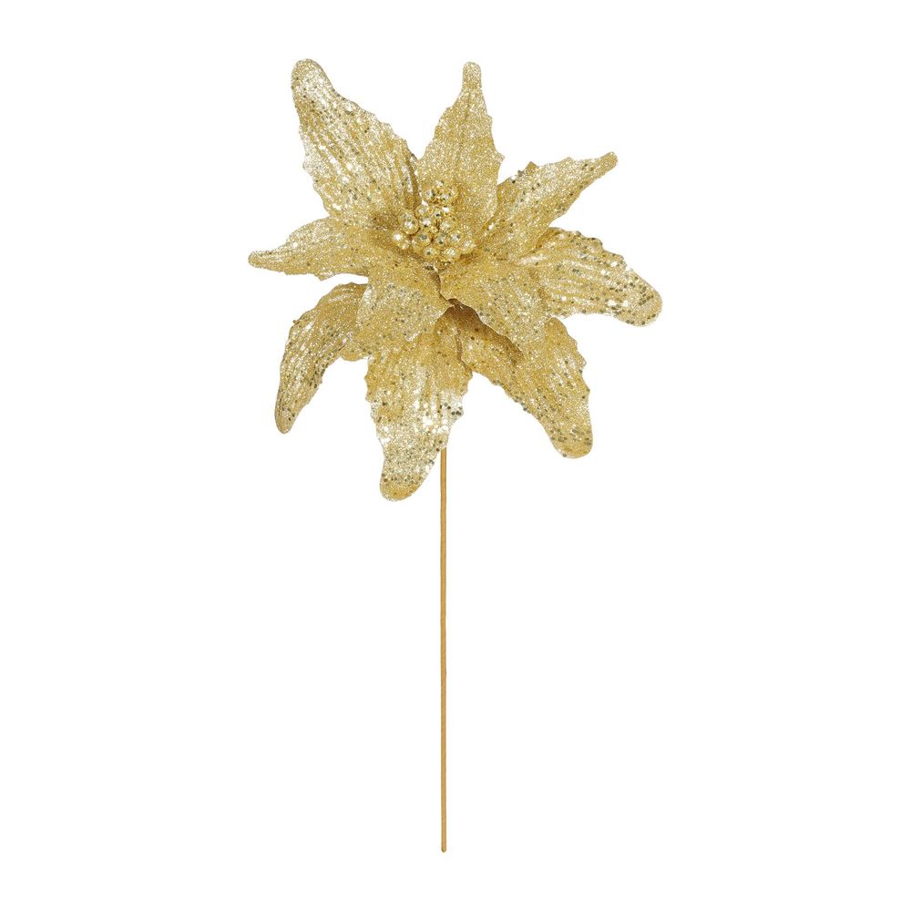 Elevate your festive decor with the stunning Gold Glitter Poinsettia Stem (67cm). This exquisite piece combines the elegance of a traditional poinsettia with a touch of shimmering gold glitter, perfect for adding sparkle to your Christmas arrangements.