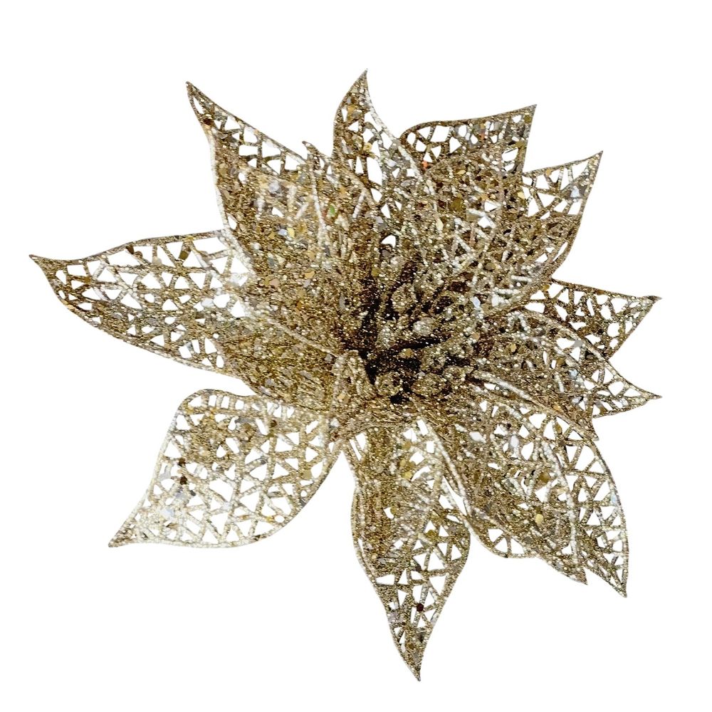 At 22cm in size, it stands out beautifully as a centerpiece or part of a larger arrangement. The glittering petals catch the light, creating a dazzling effect that enhances any space. Ideal for florists and decorators alike, the Gold Poinsettia lends a touch of glamour and sophistication to your holiday decor, ensuring a festive atmosphere with every bloom.