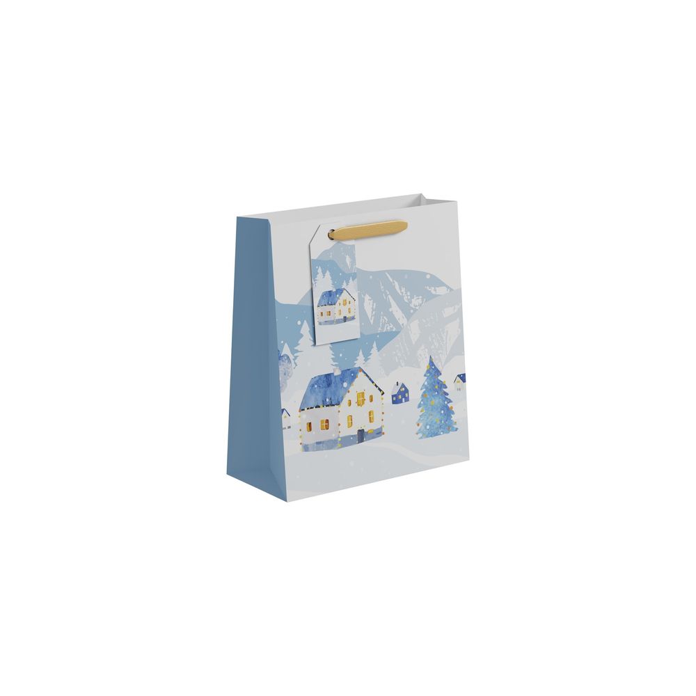 Carefully crafted, it's designed to cradle your treasured presents, adding a touch of magic to your Christmas gift-giving. Whether you're sharing a single special gift or an assortment of surprises, this bag creates a memorable presentation that captures the essence of the season. Make this Christmas unforgettable with our Medium Snowy House Scene Gift Bag, transforming your presents into cherished tokens of joy against a backdrop of holiday wonder.