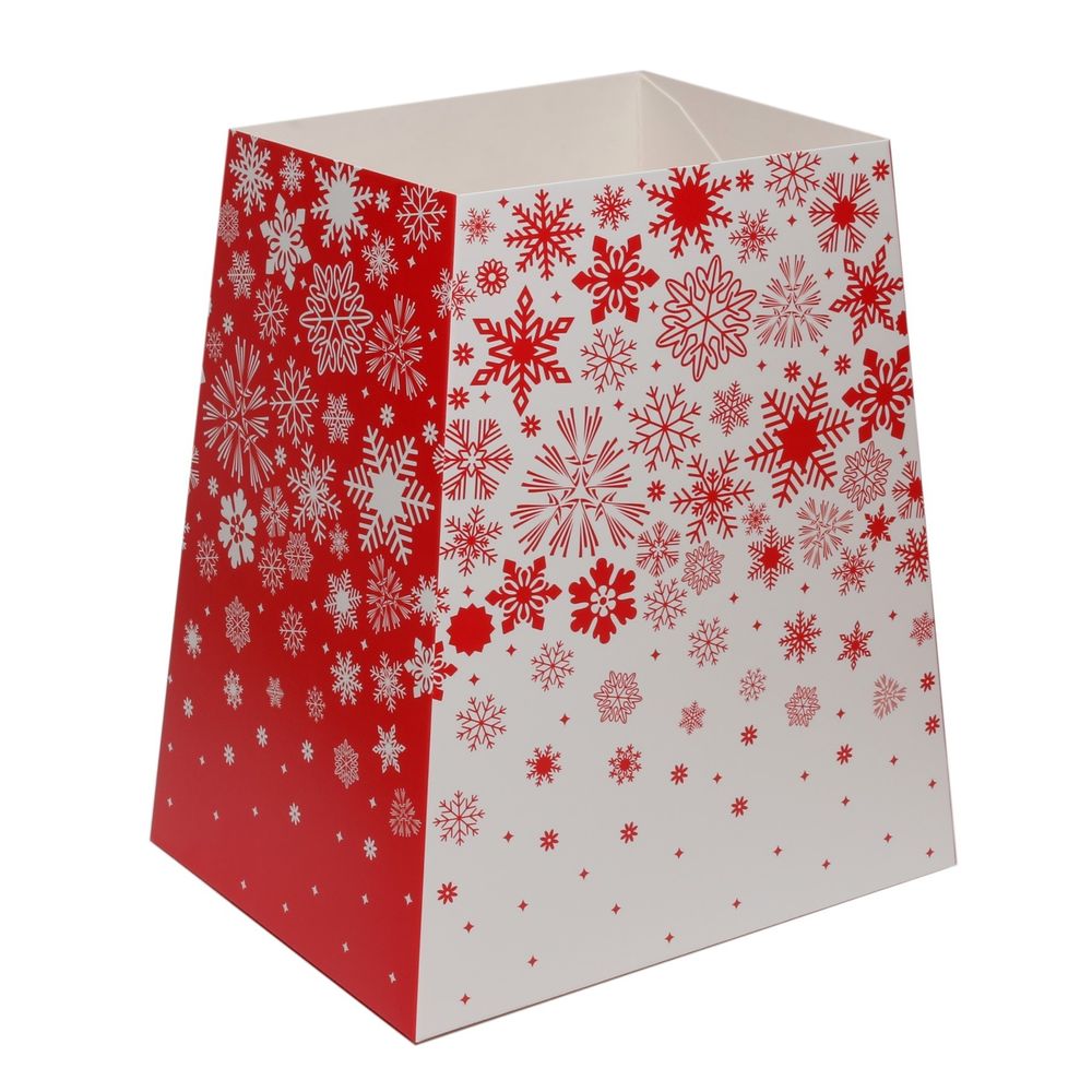 A red & white florist bouquet box with a Christmas style. This box has a traditional snowflake design.