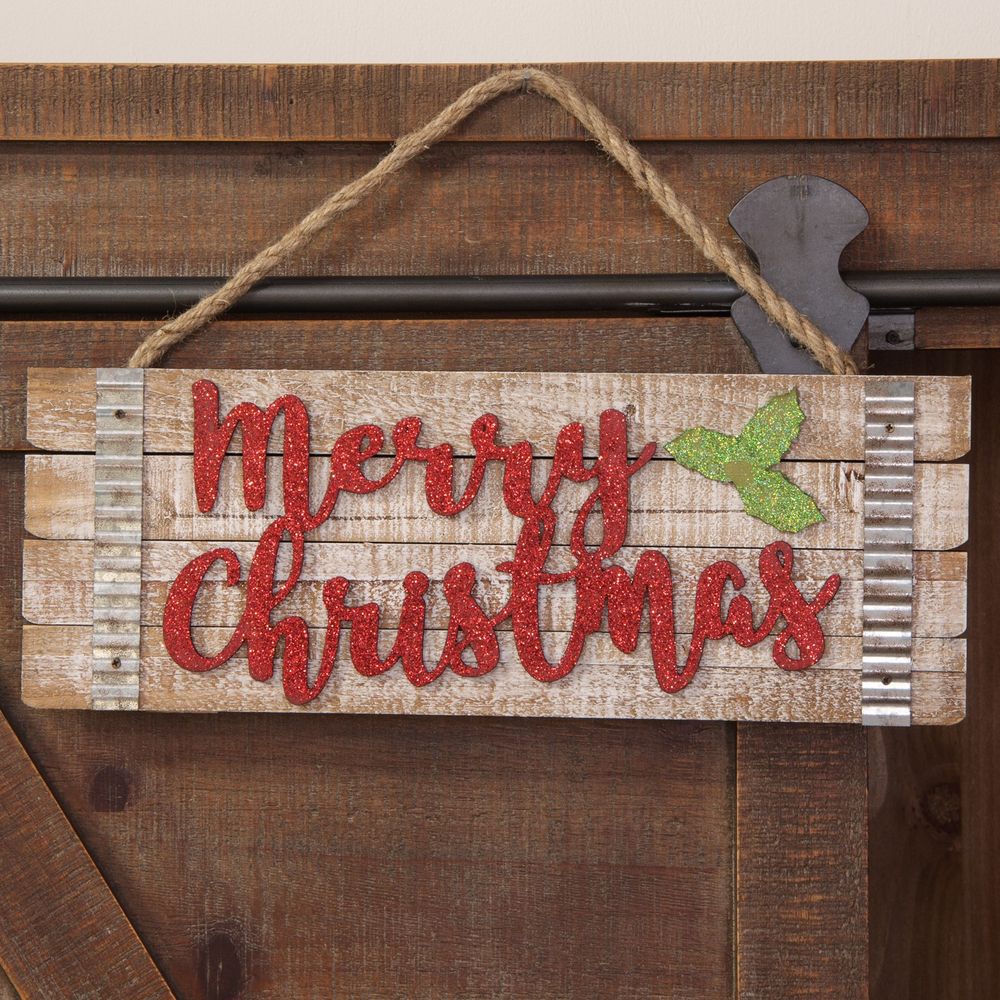 Festive hanging plaque with Merry Christmas written in red glitter on a wooden background.