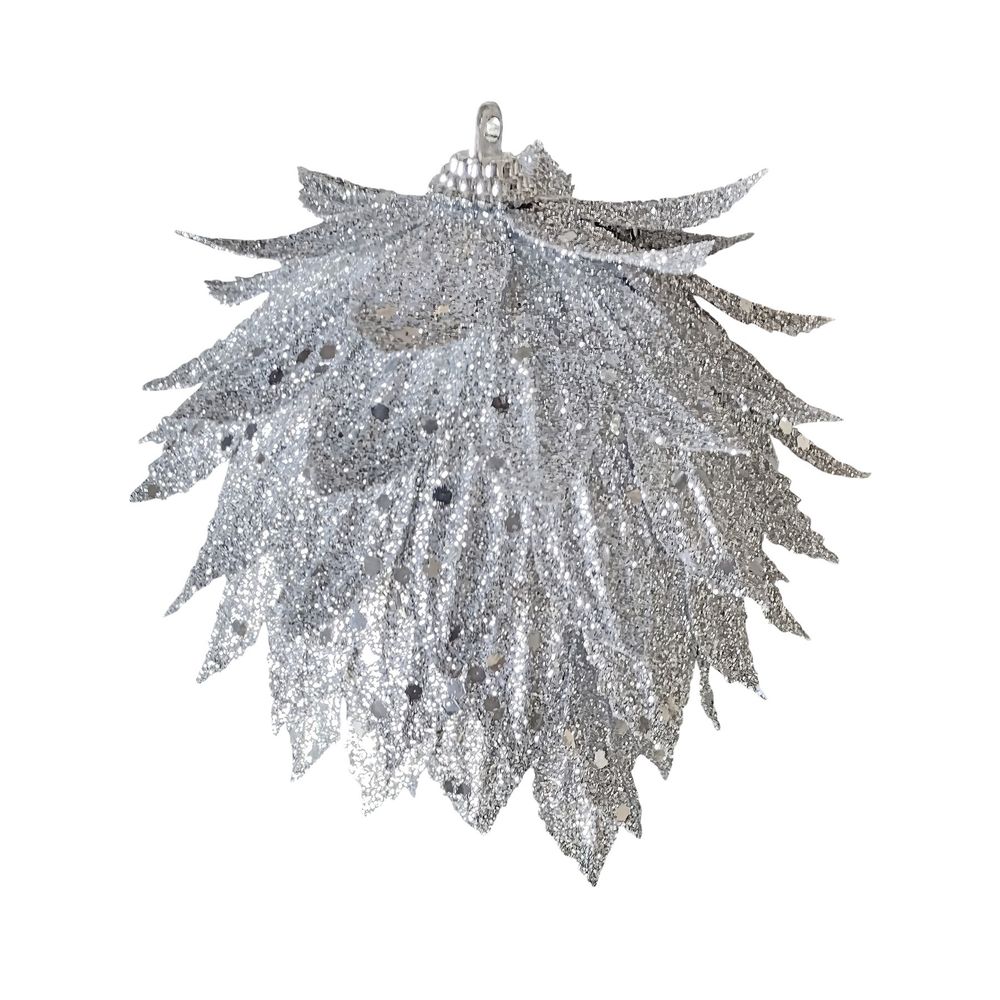Measuring 10cm, this silver-toned ornament is perfect for adding elegance to any room or tree. Its intricate floral design and glitter finish catch the light beautifully, making it a stunning accent for holiday decor or year-round charm.