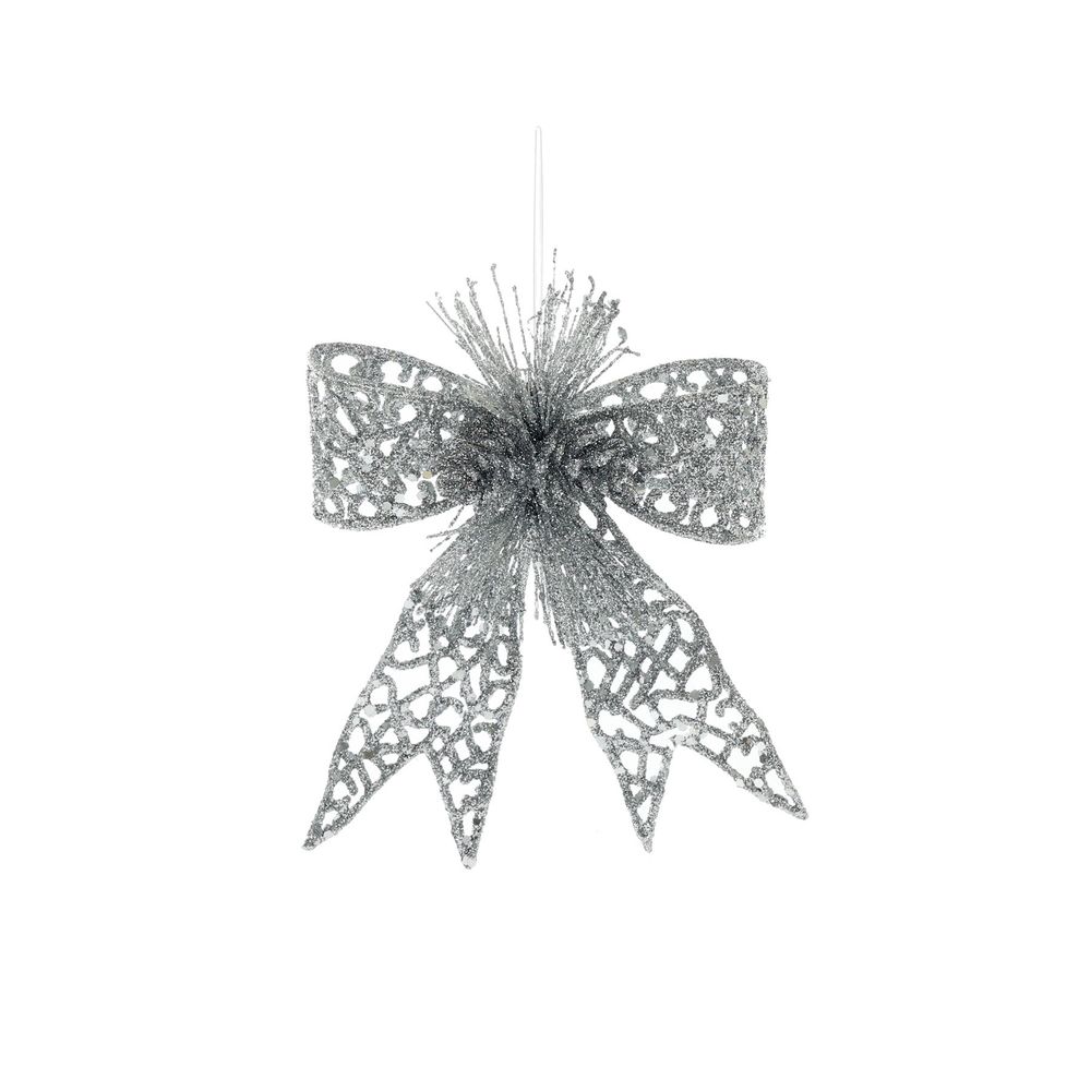 Add a festive flair to your holiday decor with the Glitter Bow Hanging Decoration in shimmering silver.