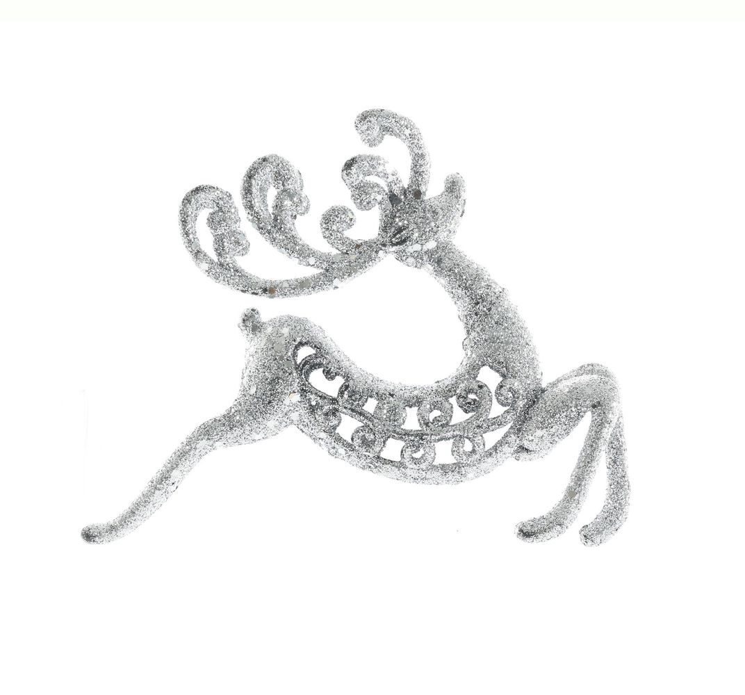 Standing 17cm tall, this charming reindeer features a dynamic pose and is coated in shimmering silver glitter, capturing the festive spirit. Perfect for adding sparkle to your tree or festive displays, this lightweight decoration offers a whimsical yet sophisticated touch to your seasonal decor. Easy to hang, it's a delightful highlight for any Christmas setting.