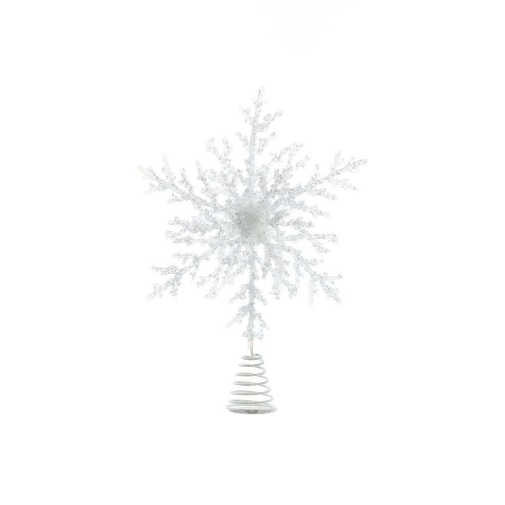 Measuring 35cm, this elegant white topper features a beautifully detailed snowflake design. Its crisp white finish enhances the festive look, making it a perfect centerpiece for any holiday tree. Easy to place and securely positioned, it completes your tree with a touch of seasonal magic.