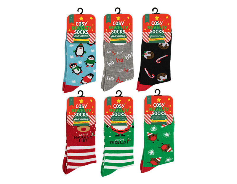 Celebrate the season in style with our Assorted Ladies' Novelty Christmas Socks, featuring a charming array of festive designs. From cheerful Santas to adorable reindeers and festive treats, each pair adds a touch of holiday magic to your wardrobe. Crafted for comfort and durability, these socks are perfect for keeping feet warm and cozy during Christmas festivities. Ideal for gifting or personal indulgence, they combine whimsical flair with practicality. Embrace the joy of the holidays with these delightful socks, designed to bring festive cheer and comfort to every step throughout the merry season.