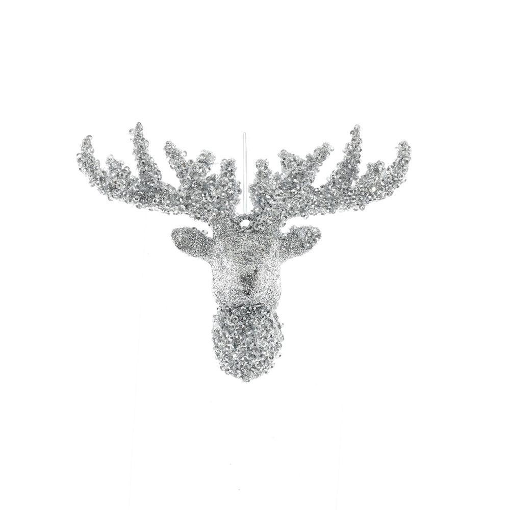Embrace the spirit of the season with this charming silver glitter reindeer head hanging decoration. This delightful ornament features a beautifully detailed reindeer head, adorned with a shimmering silver glitter finish that catches the light and adds a festive sparkle to your holiday décor. Perfect for hanging on Christmas trees, doorways, or as part of a seasonal display, this decoration brings a whimsical yet elegant touch to any space. Lightweight and easy to hang, it adds a playful element while maintaining a sophisticated look. Celebrate the magic of the holidays and elevate your festive atmosphere with this enchanting reindeer head ornament.