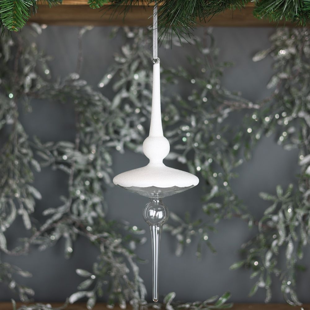 Make a bold statement with the Glass Pianillo Finial in clear and white. Standing 37cm tall, its striking design combines transparency with a frosted finish, creating a sophisticated and eye-catching centerpiece for your holiday decor,