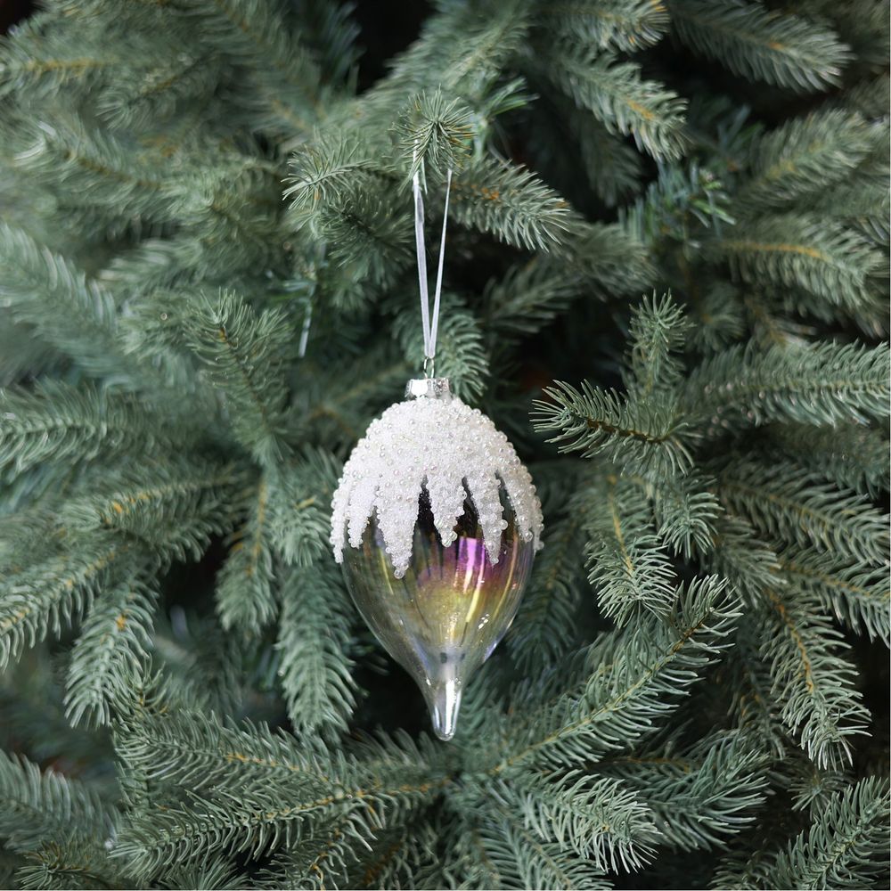 Create a frosty, enchanting atmosphere with the Glass Snowcap Finial in white and iridescent. Measuring 16cm, its shimmering finish and elegant design add a magical touch to your holiday decor.