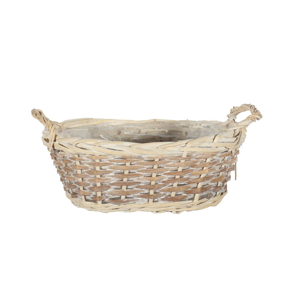 Natural softwood oval shaped woven planter basket with side handles and white wash finish. Plastic lined to make it perfect for floristry arrangements..
