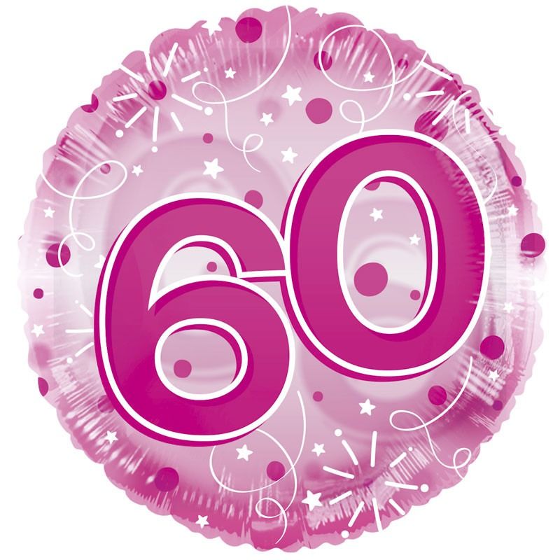 This balloon features a pink Age 60 design on see through material.