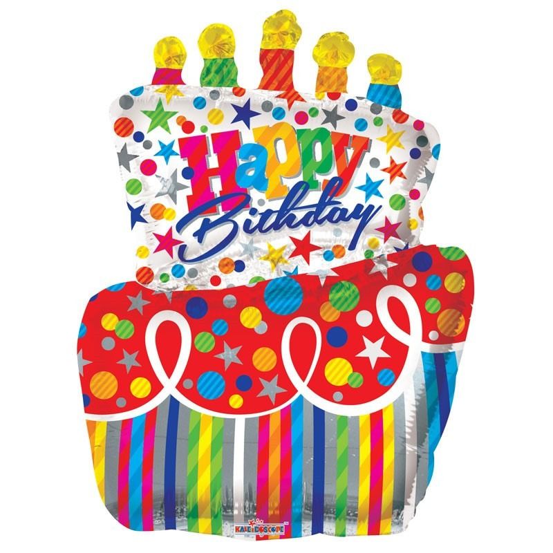 This balloon is in the shape of a cake and features a colourful birthday design.