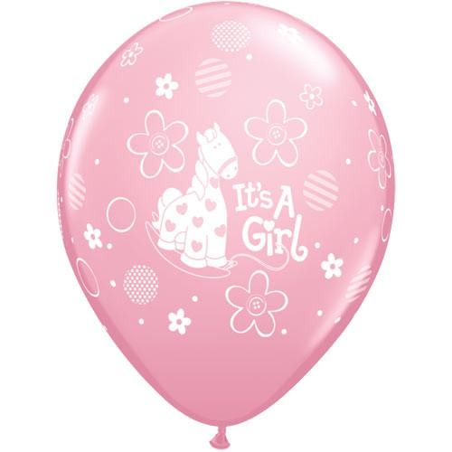 These gorgeous pale pink latex balloons feature a cute pony and the wording "It's a girl". These will look lovely decorating your home in celebration of the arrival of a special baby girl or for a baby shower party