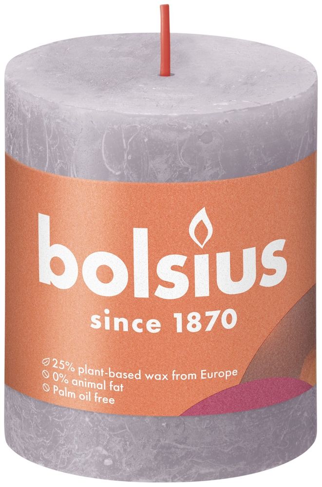 Make every moment a special one! The natural light of candles brings a unique warmth and ambience into your home and makes it cosy. Bolsius's rustic pillar candle coming in the blue tone Frosted Lavender boasts a full 8cm in height and burns for a good 35 hours. The mark of a quality candle is its long burning time and its ability to maintain its shape while burning. Bolsius's rustic candle doesn't smoke or drip and has a nice, rustic finish. Made with love for people and planet. With natural, vegan wax from Europe and zero palm oil. The cotton wick is weaved in such a way that your flame remains stable. In that way no black smoke, soot deposits or smoke arises whilst burning.