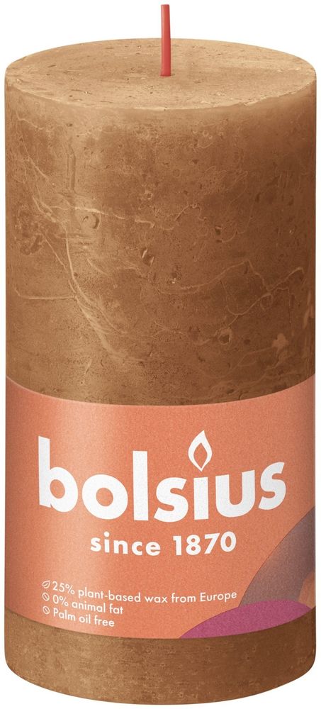 Make every moment a special one! The natural light of candles brings a unique warmth and ambience into your home and makes it cosy. Bolsius's rustic pillar candle coming in the light brown tone Spice Brown boasts a full 13cm in height and burns for a good 60 hours. The mark of a quality candle is its long burning time and its ability to maintain its shape while burning. Bolsius's rustic candle doesn't smoke or drip and has a nice, rustic finish. Made with love for people and planet. With natural, vegan wax from Europe and zero palm oil. The cotton wick is weaved in such a way that your flame remains stable. In that way no black smoke, soot deposits or smoke arises whilst burning.