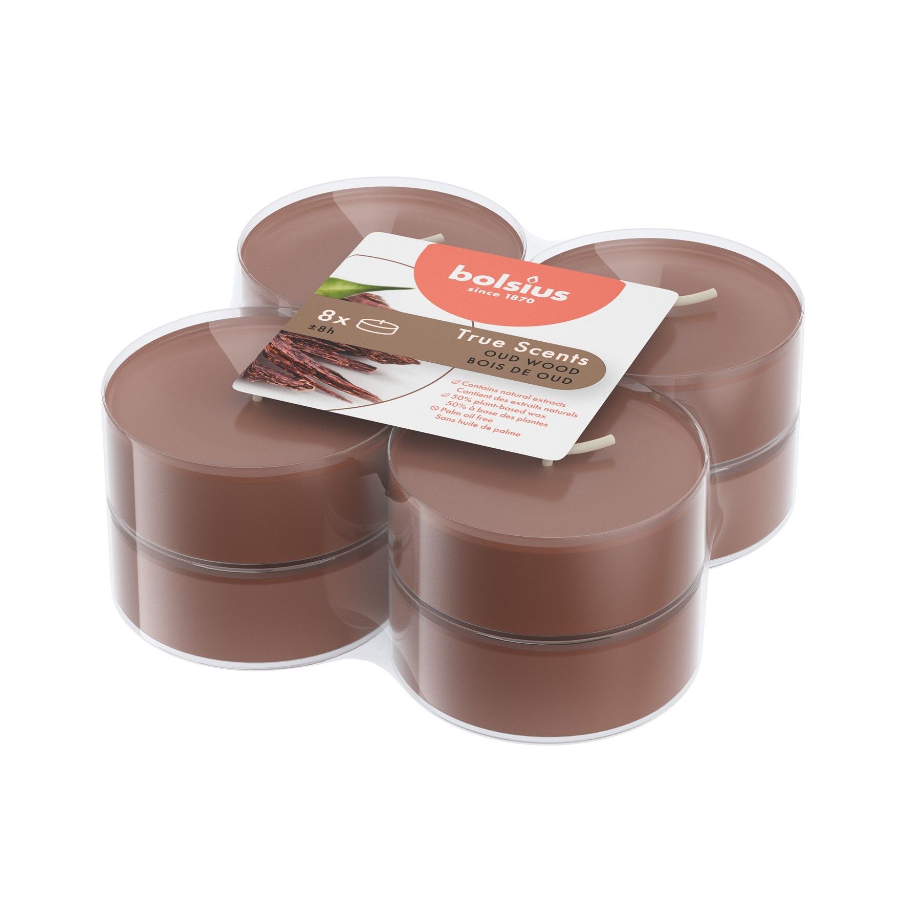 The Bolsius True Scents Maxi Tealights in Oud Wood, 4.6cm x 11.5cm, come in a pack of 8 and offer a warm, luxurious oud wood fragrance.