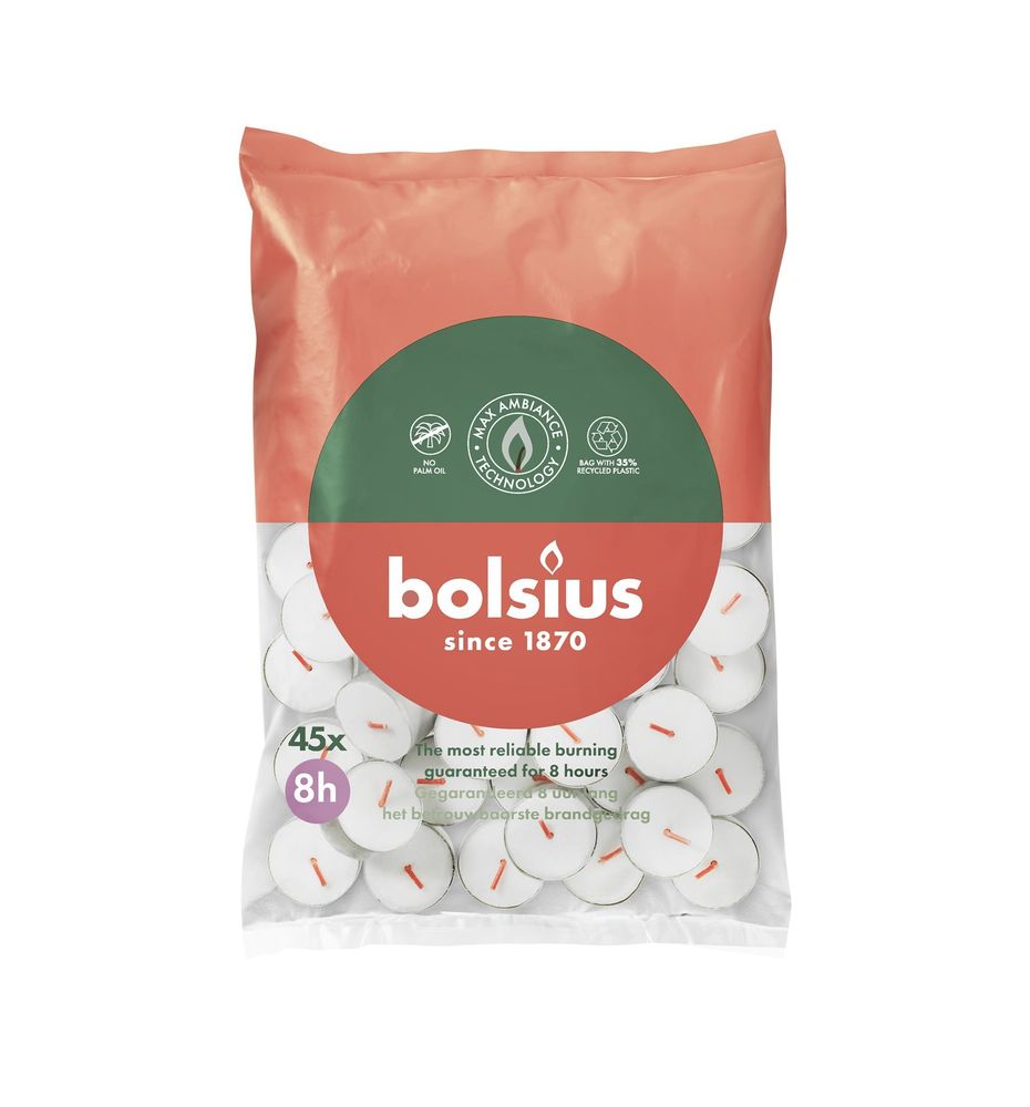 Illuminate your space with Bolsius White Tealights. This bag of 45 tealights offers the perfect ambiance for home decor and events. Each candle provides an impressive 8-hour burn time, ensuring long-lasting, beautiful light. Ideal for candle holders, these tealights are versatile and add a warm, inviting glow to any setting.