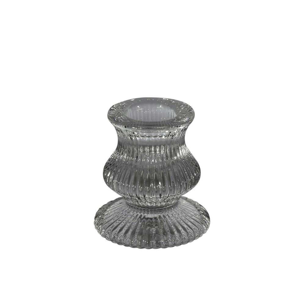 Ribbed glass taper candle holder which measures 6cm high by 5.5cm wide.