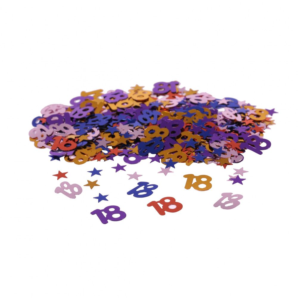 A pack of multi coloured shimmering star number 18 confetti.