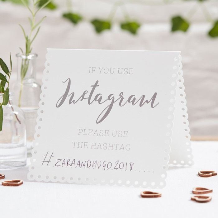 Personalise the blank space on the tent card with your very own '#' and ask your guests to use this hashtag when uploading their images online. A quick and easy way to ensure you can relive your magical wedding day for years to come.