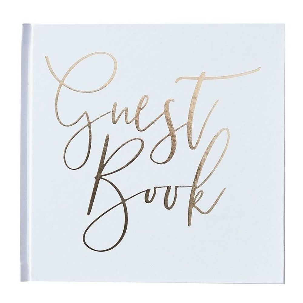 The white hard back guest book with gold foil writing can be placed on its own table with our 'Gold Love Confetti' to create a stunning display that your guests will love. The simple design means this can also be used as a cute baby shower guest book!
