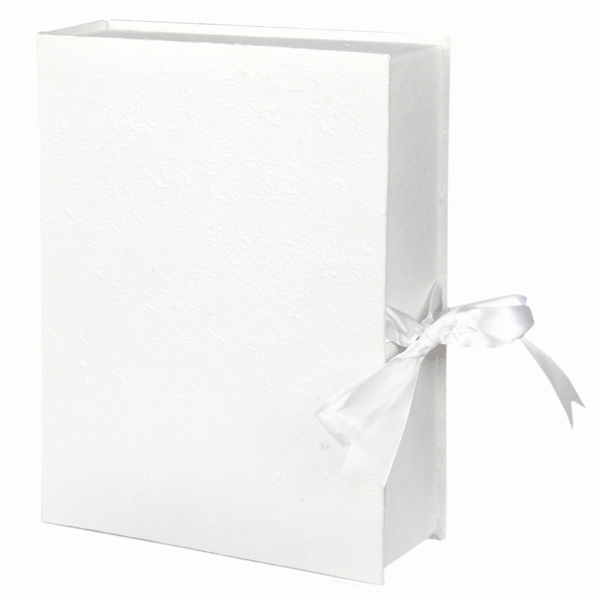These match our guestbooks and photo albums. Superior quality handmade mulberry paper keepsake boxes suitable for personalisation for new baby, christenings and weddings. Would also be ideal as a high quality gift box for clothing or fragile items. Inner dimensions 28 x 22 x 6.5 cm. Outer dimensions 29.5 x 23.5 x 7.5cm. Tied with white ribbon. As these boxes are all individually handmade, the texture of the mulberry paper covering varies from book to book.