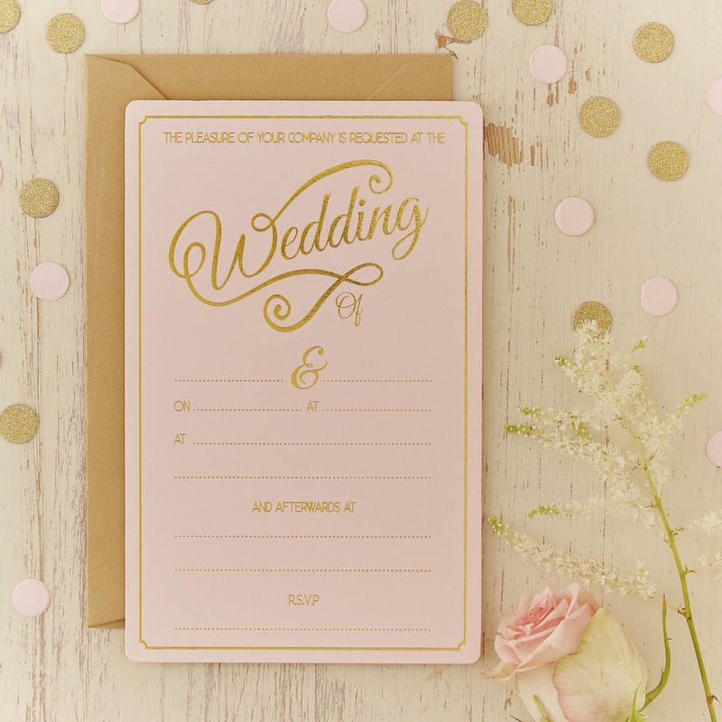 A beautiful set of 10 wedding invitations in dusky pink and gold foil.