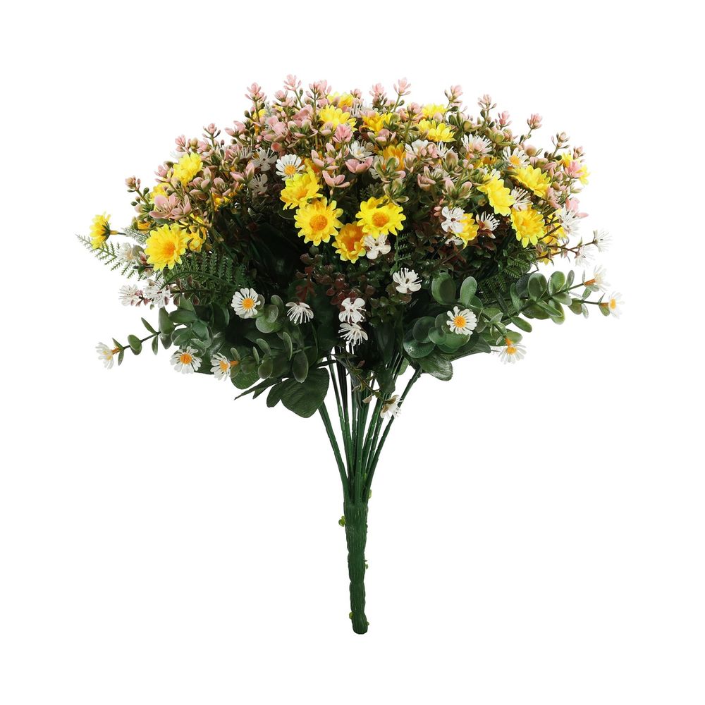 The cluster of miniature flowers creates a light, meadow inspired look, while the generous number of stems provides a full and lively arrangement. The sunny yellow shades add warmth and brightness, making this bush perfect for vases, floral arrangements, centerpieces, or seasonal decorations.