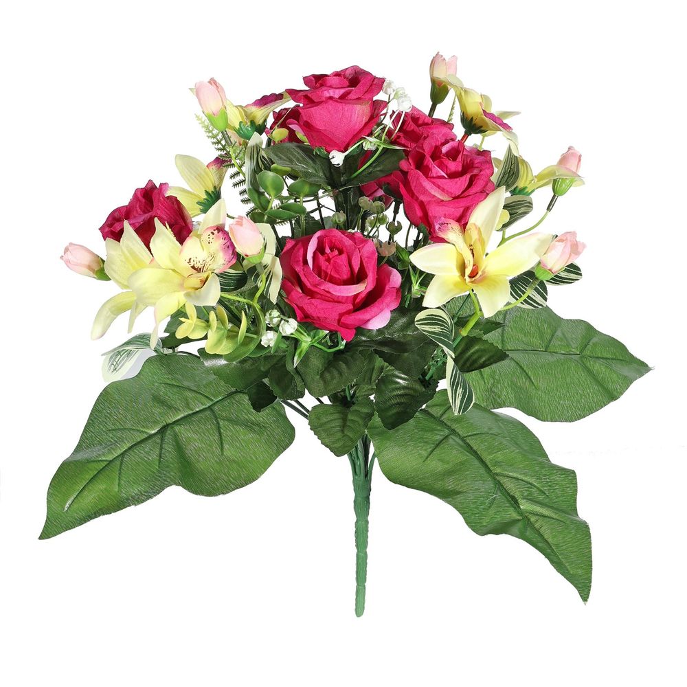 Add some amazing decor to any room in your home with our Purple Pembroke Leafy and Orchid Mixed Bunch! This delightful mix of artificial purple roses and leafy orchids, provides your living space with a warmth and charm that can't be found anywhere else.