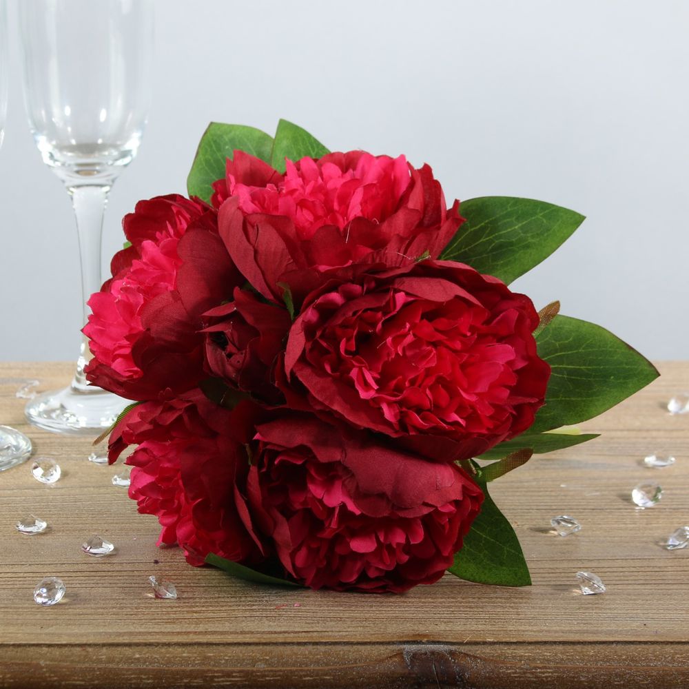 Will delicate petals crafted in a fully open style, these peonies are complimented with realistic foliage on stripped stems and neatly tied together with string.