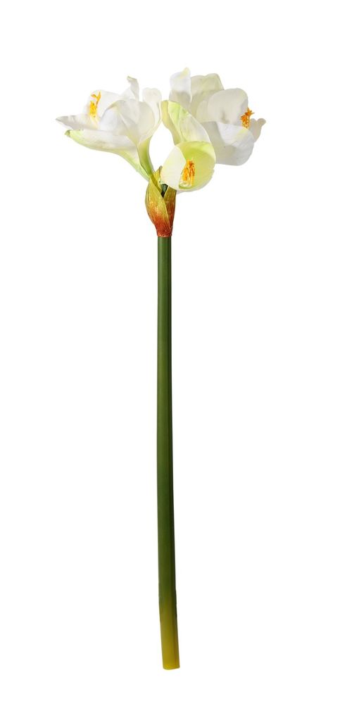 A pretty and realistic white Amaryllis with a leaf free stem and a cluster of flowers.