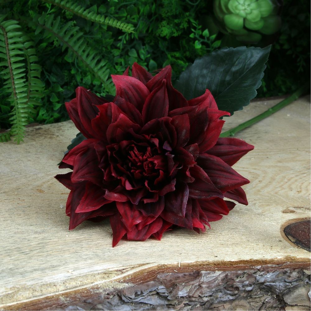 A single stem, this silk features one open fluffy head in a dark red colour and finished with complimenting foliage.