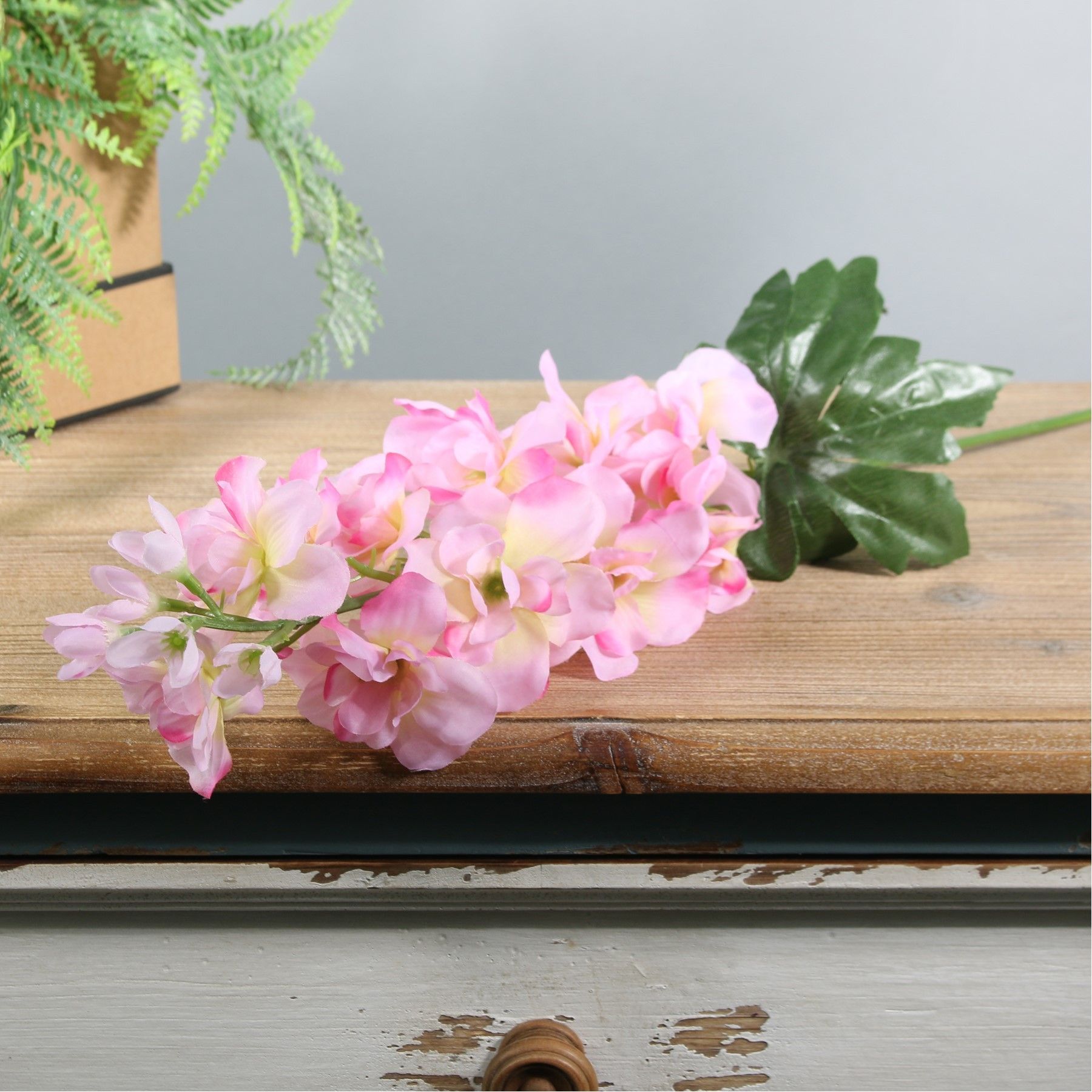 This beautifully crafted artificial stem features delicate blush pink blossoms arranged along a tall, slender stem, perfectly mimicking the natural charm of real delphiniums.