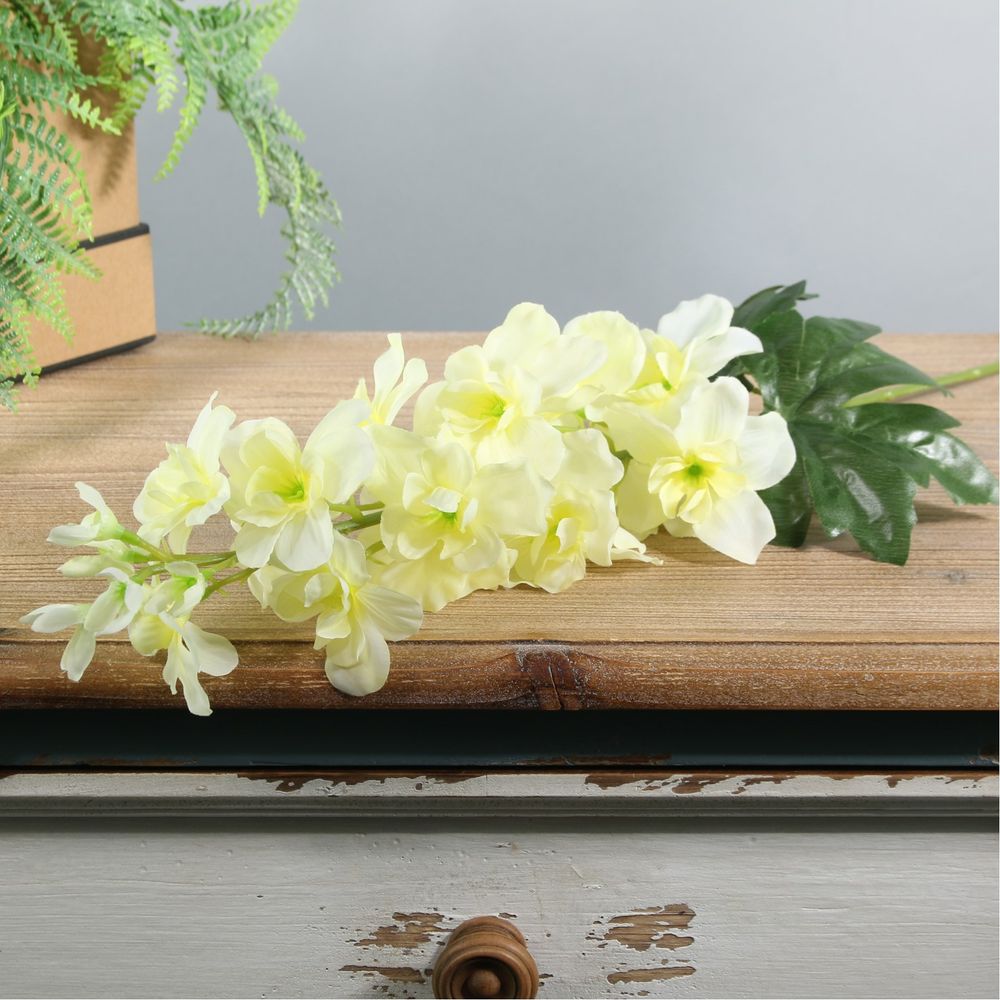 Brighten your rooms with this highly realistic artificial delphinium stem in a pretty yellow shade. Decorate your event or home with these lasting silk flowers.