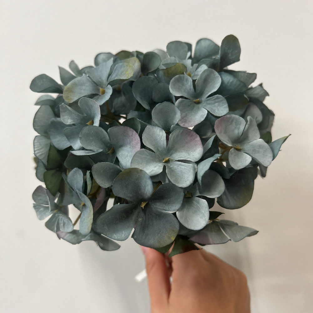 A single stem, this silk features one open fluffy head in a light blue, with complimenting foliage.
