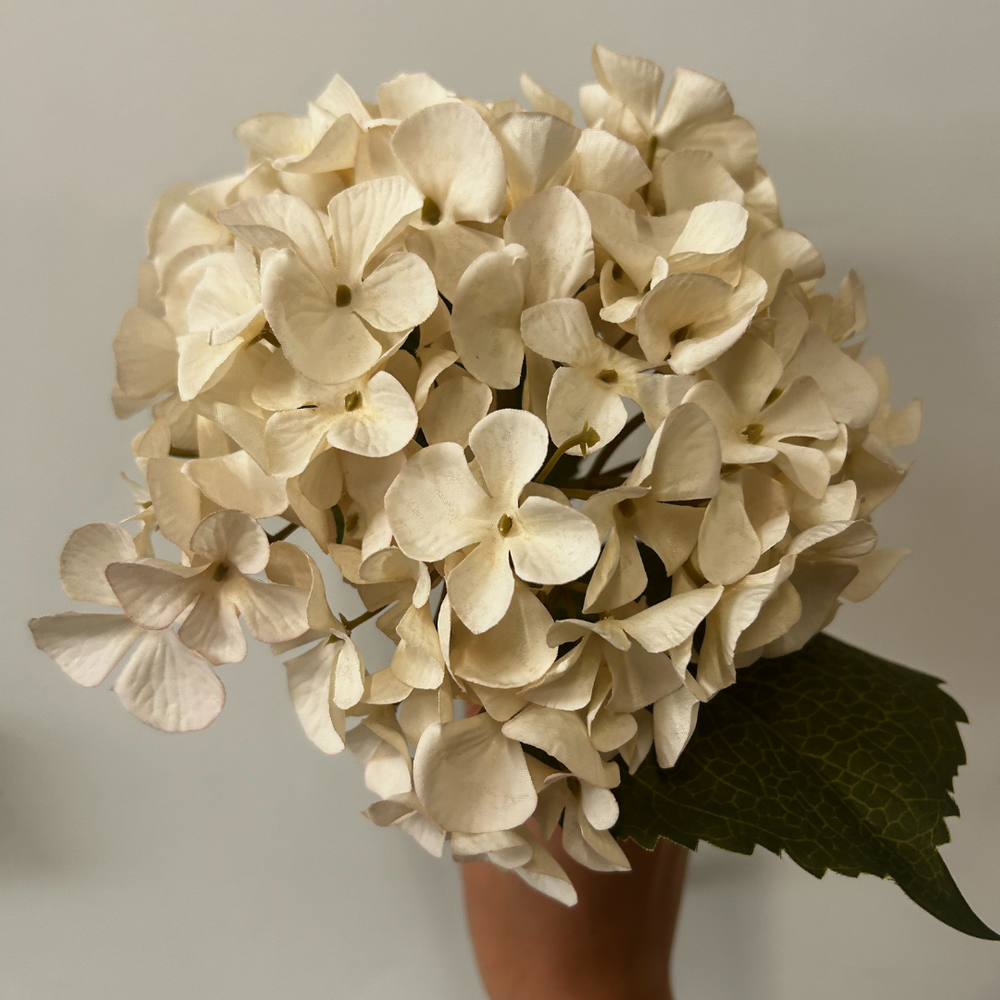 A single stem, this silk features one open fluffy head in a rich cream, with complimenting foliage.