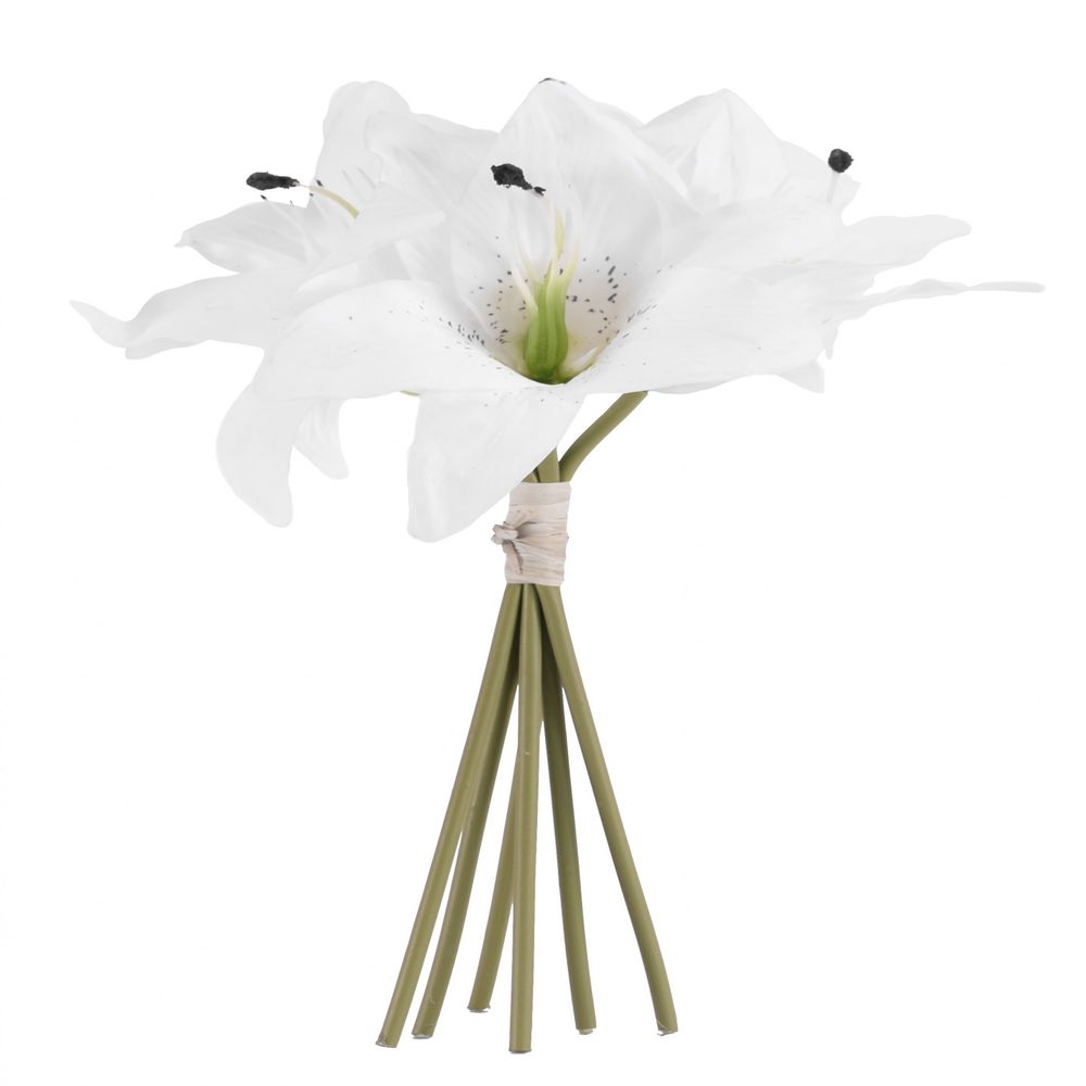 A delicate bouquet of simple white lilies, staggered in height, a high quality silk with real attention to detail.