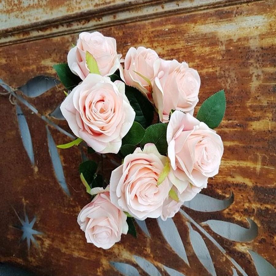A bouquet of nine open rose flower heads in peach, surrounded by foliage