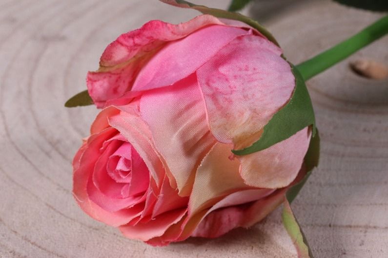 A pretty single stem, featuring one small closed rose bud in pink with graduating foliage up the stem. A classic garden favorite, used as a filler for floral arrangements or alone. A perfect addition to a country or woodland themed wedding or event.