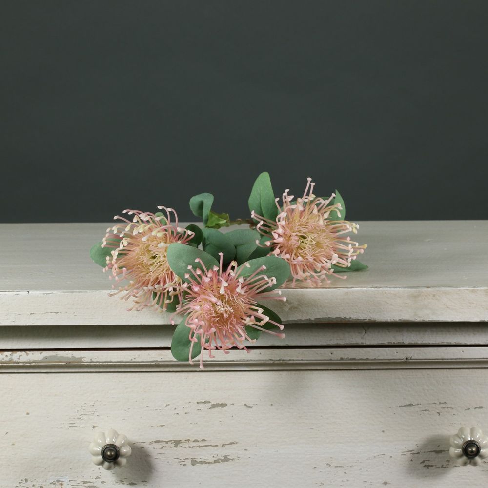 A gorgeous Tintagel Leucospermum Pink artificial flower with a realistic and natural style. Display these at home in a vase or use to decorate your space or event!