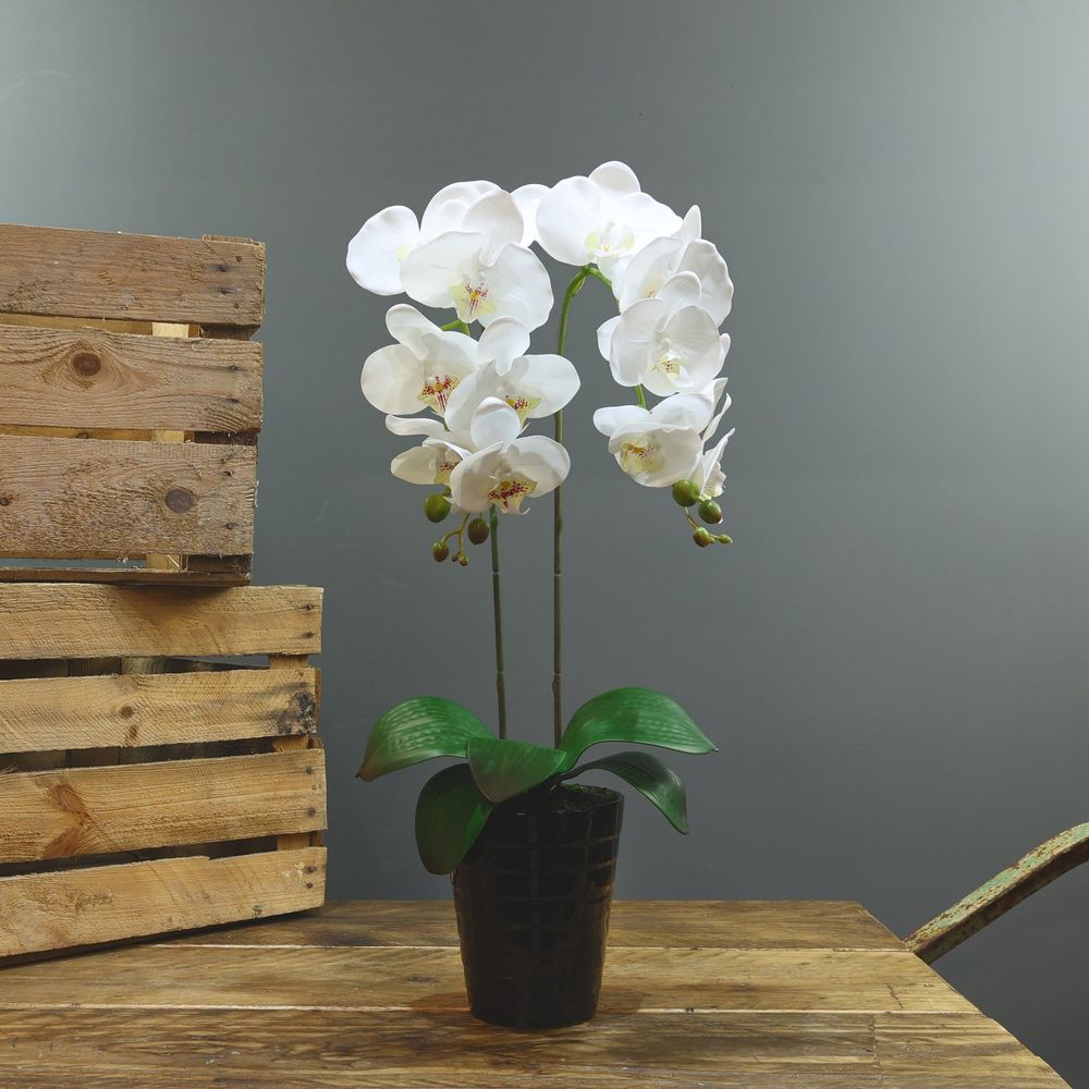 With a classic style, this Aragon orchid is finished in a highly realistic style and two stems full of pure white blooms. Complimented by the textures of the leaves and buds, this phalaenopsis orchid also comes complete with a black ceramic planter.
