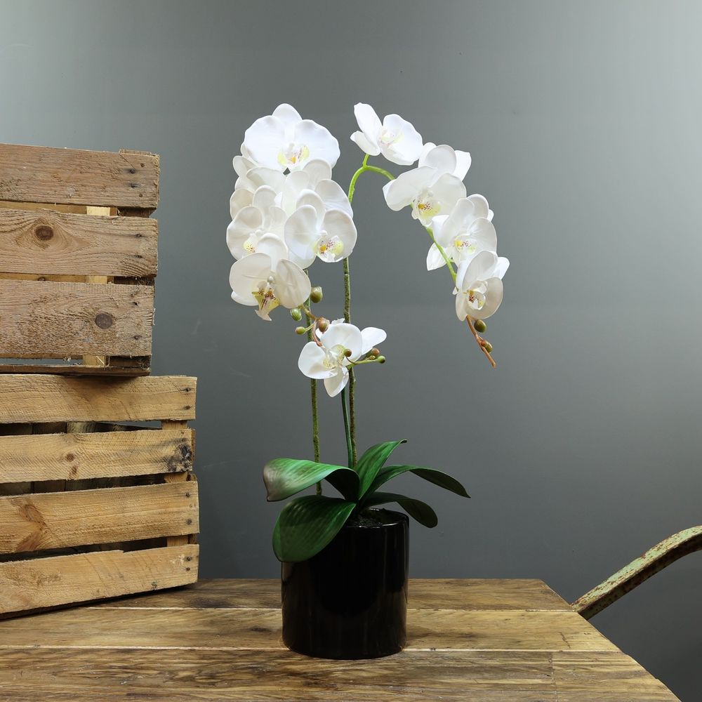 With a classic style, this Aragon orchid is finished in a highly realistic style and two stems full of pure white blooms. Complimented by the textures of the leaves and buds, this phalaenopsis orchid also comes complete with a ceramic planter.