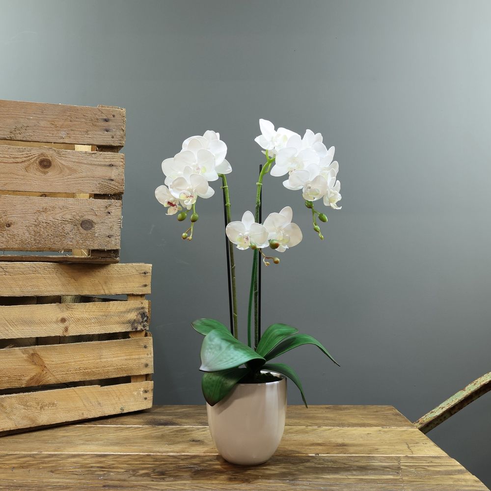 With a classic style, this orchid is finished in a highly realistic style and three stems full of pure white blooms. Complimented by the textures of the leaves and buds, this phalaenopsis orchid also comes complete with a ceramic planter.