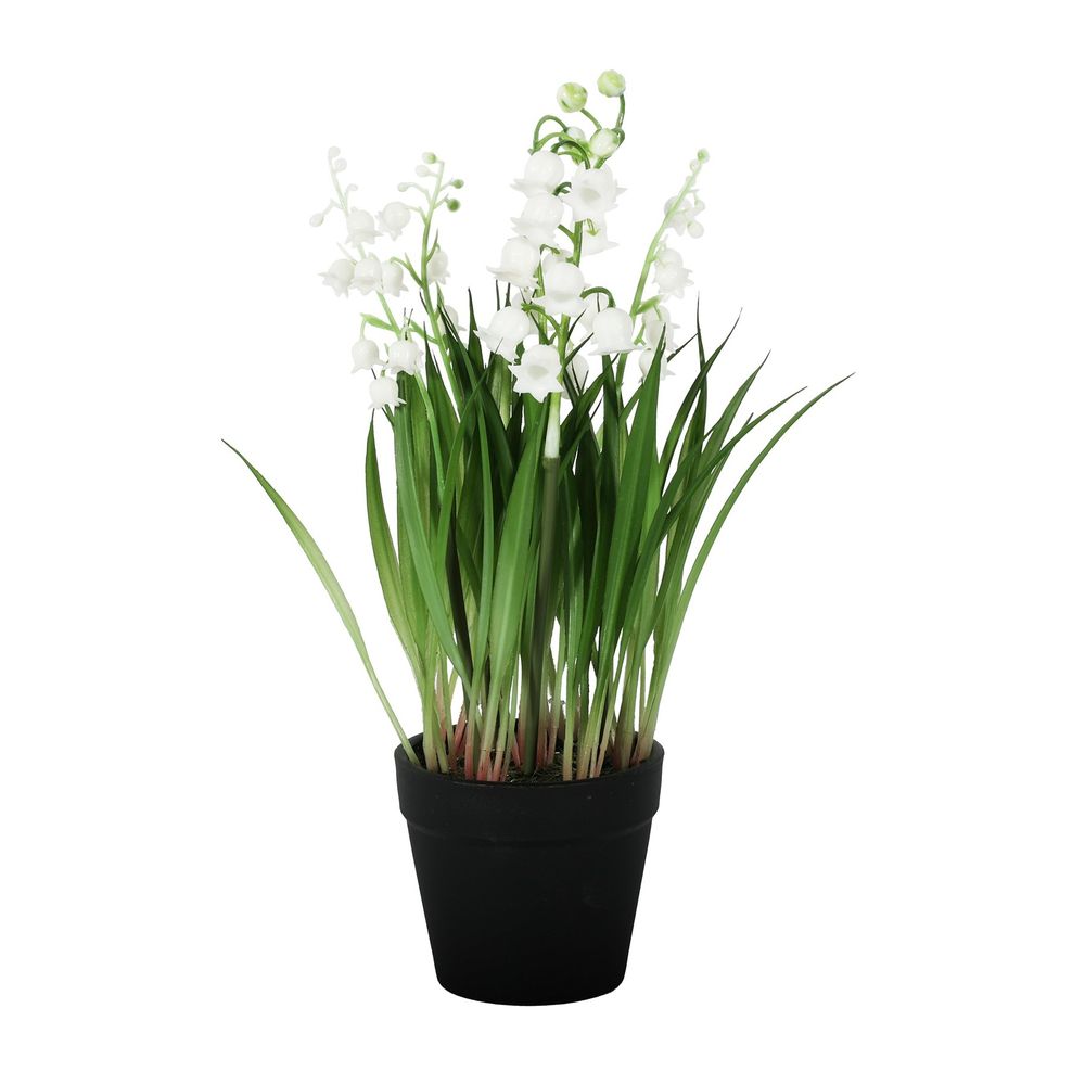 Featuring graceful green leaves and clusters of small, bell shaped white flowers, this elegant arrangement captures the charm of real lily of the valley without any upkeep. The plant is set in a simple black pot, making it easy to place inside decorative planters or display as it is.