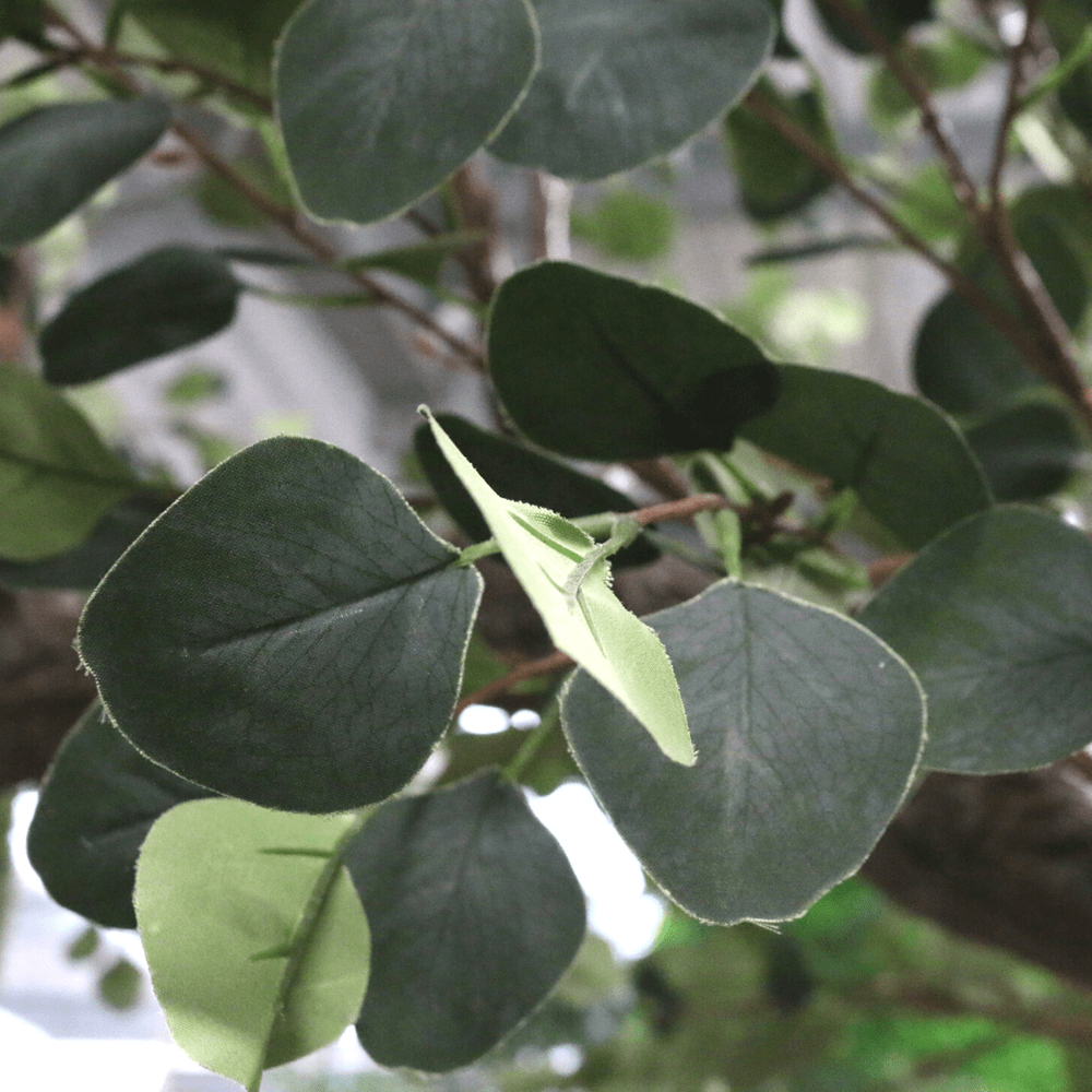 With a slim trunk that curves to one side, and finished with realistic veining and bark finish, this tree features several sprays of branches with a realistic tonal selection of eucalyptus leaves.