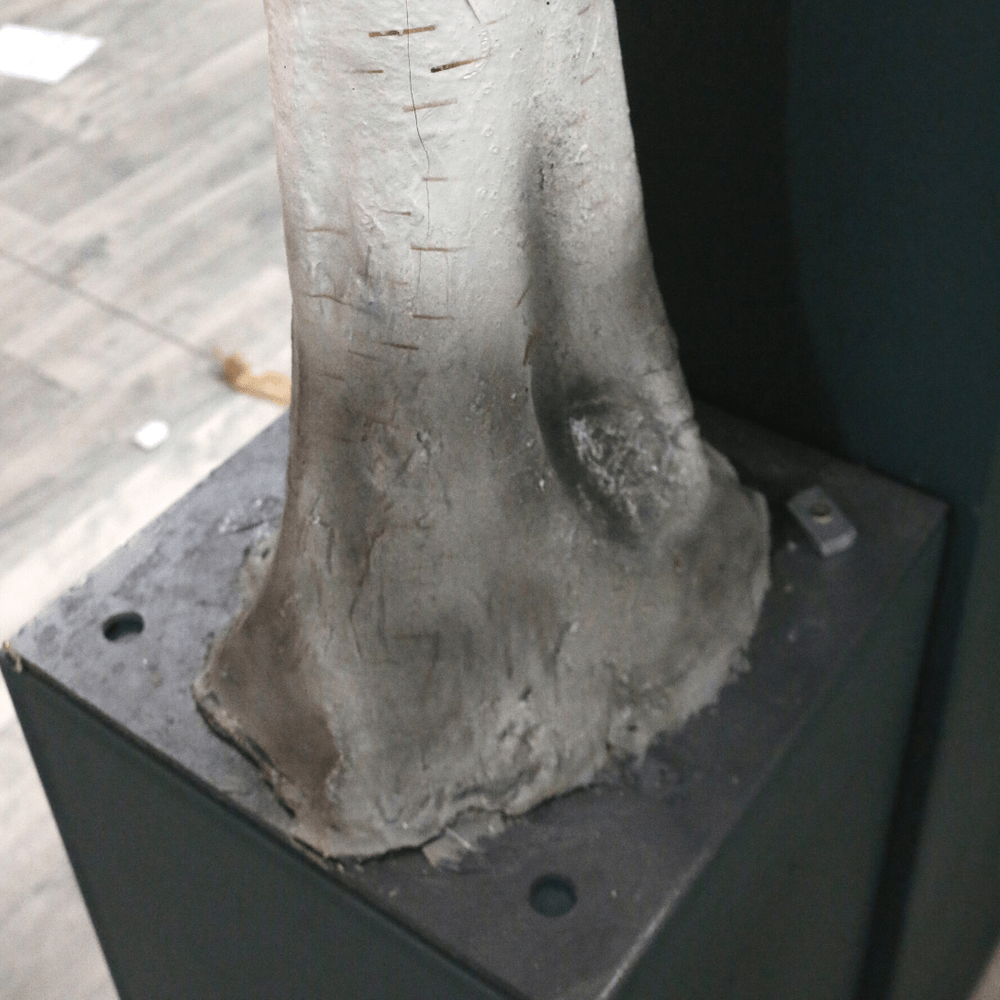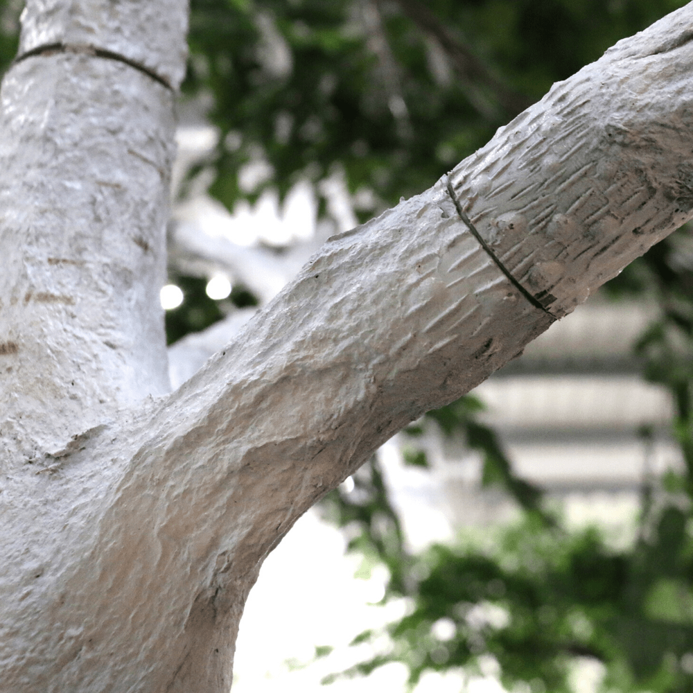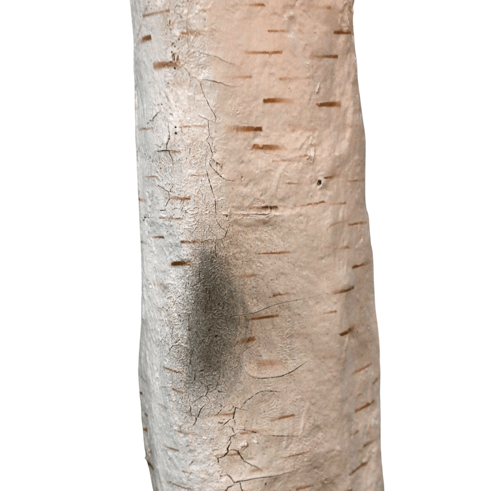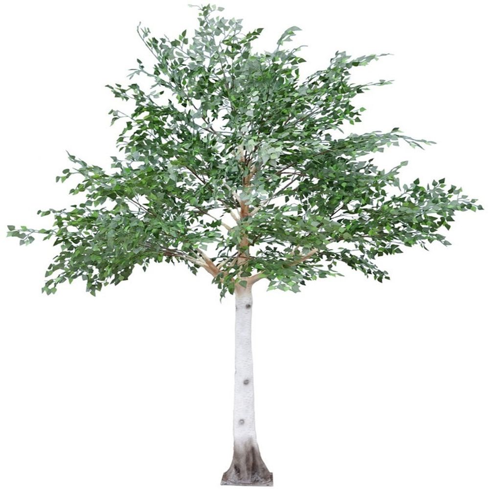 The sturdy, upright trunk is finished with papery bark and finished with realistic knots and markings and spreads out to a wide canopy complete with realistic foliage in a mature tree shape.