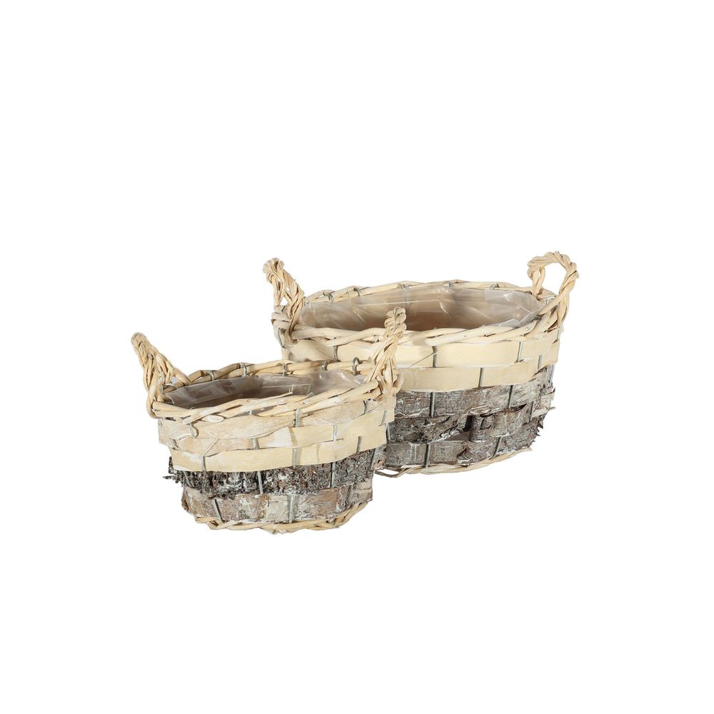 Set of two, two tone round planter baskets crafted from thick bands of white-washed softwood and unfinished, raw softwood. The combination of the two textures give these planters an earthy and rustic charm.