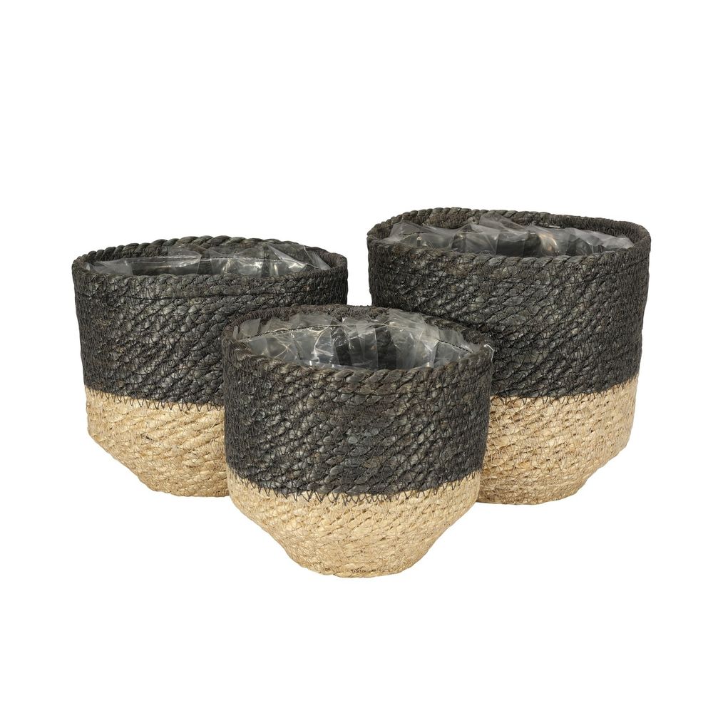 A set of 3 Jute braided rope baskets with inner liner ideal for plotted plants and flowers. The inner liner ensures that any moisture or water stays within the container.