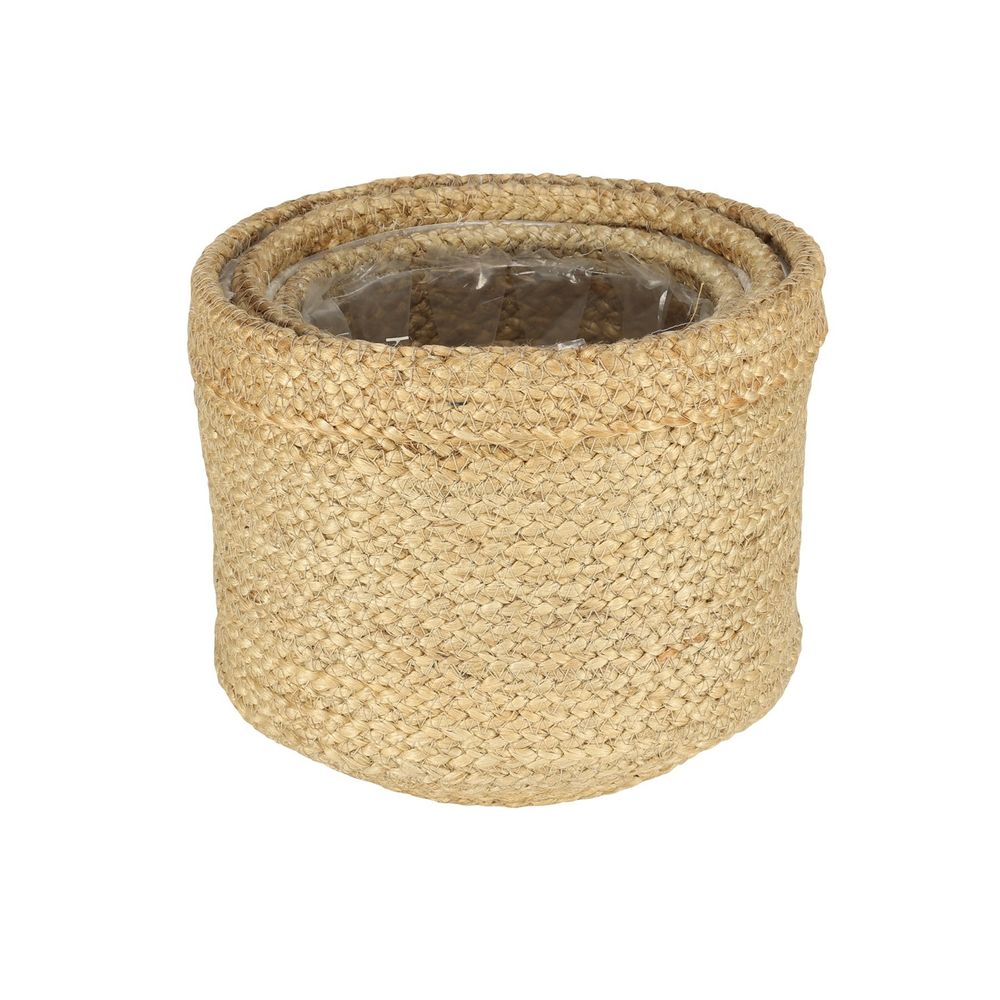 A set of 3 Jute braided rope baskets with inner liner ideal for plotted plants and flowers. The inner liner ensures that any moisture or water stays within the container.