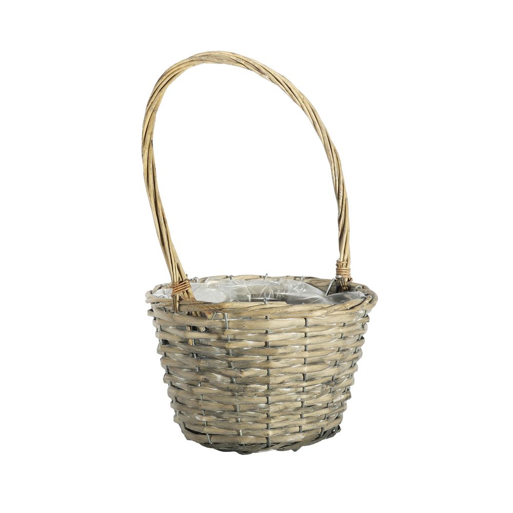 Charmingly rustic grey wash split willow woven round basket with handle. Plastic lined to make it suitable for floral arrangements using wet floral foam.